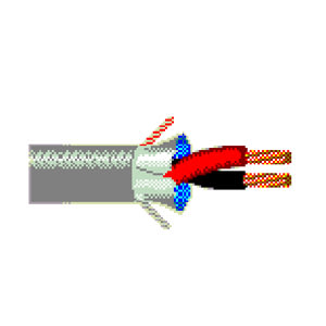 A shielded audio cable has two solid or stranded copper wire cores with polyvinyl chloride (PVC) colored insulation and a foil shield under a PVC jacket. There's a bare drain wire under the jacket in contact with the aluminum foil shield.
