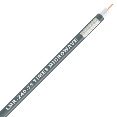 The LMR 240-75 ohm coaxial cable is a flexible, low-loss cable manufactured by Harbour Industries. This cable features a bare copper inner conductor and an aluminum tape outer conductor, which enables the tightest bend radius of any cable of similar size and performance. It also has a foam PE dielectric, a tinned copper braid, and a black PE jacket. The LMR 240-75 has a voltage rating of 1500V, a maximum temperature of 85°C, and is UV resistant.
