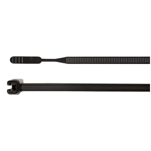 Q-Ties have a distinctive open-style head, a pre-lock function, and a large ribbed tail. Part number 109-00105 provides this functionality. The easily detectable slot opening offered with the tail and tie head provides ease of placement when working with gloves or for blind applications with limited view of the installation. The pre-lock feature allows for temporary holding of cable and wire bundles, permitting additional cables and wires to be placed without destroying the cable tie. Q-Ties can be tensioned by hand or with one of HellermannTyton's mechanical cable tie application tools.