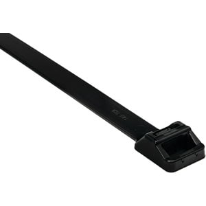 Heavy duty T-Series cable ties feature inside serrations to provide a positive hold on wire and cable bundles. Part number 111-01126 provides this functionality. Durable head design guarantees high tensile strength and a low insertion force. The bent tail allows quick and simple installations by hand. For high-volume applications, tensioning tools are available to ensure consistent and safe installation.