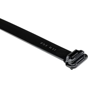 The Heavy Duty Wide-Strap Cable Tie was designed to minimize the pinching of soft bundles and the potential of lateral movement along the bundle. Part number 111-12301 provides this functionality. The low-profile head and underside clamping rails increase the grip around the bundle and provide a better fit than traditional cable ties. These are used primarily in the trucking and heavy equipment industries, but can be used in a wide variety of applications where strength is needed.