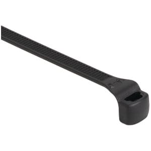 Compact. contoured head fits tight spaces and protects adjacent bundles. Outside serrations minimize damage to cable insulation. making tie ideal for high-vibration applications. Choice of materials optimized for indoor or outdoor use. Bent tail allows for easy insertion. Easy application either manually or with a tensioning tool.