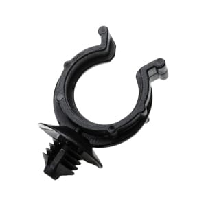 Clip includes an internal rib that spans the inside of the bracket to fit securely into the profile of the tubing to prevent lateral movement and slipping of the tubing. Extended fir tree allows for a wide range of panel thicknesses. Fir tree design provides low insertion forces and high extraction forces.