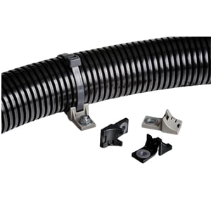 Tie/mount combination eliminates the need to carry multiple sizes of fixed bundle diameter clamps. Can be assembled directly on harnesses or on production line for installation versatility. Available in PA66 heat-stabilized or PA46. they are suitable for various temperature grades. Designed to meet strict automotive standards. they are well adapted to vibration and lateral forces. Metal inserts withstand high-torque tightening. H-design allows full contact with harnesses or other tubes and hoses. Mainly adapted to T120R and T120S cable ties but can also be assembled with smallest sizes.