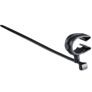 The MOC to Swivel Tie is a rotatable routing clip coupled to a cable tie that keeps two routings secured and separated. Part number 156-01656 provides this functionality. Tie provides additional security against axial slip by clamping around solid tube, pipe or harness. The swivel coupler allows the two routings to rotate independently of each other.