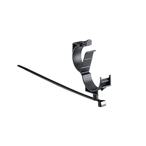 HellermannTyton's 1-Piece Cable Tie with Pipe Clip secures cables to tubular frame rails. Part number 156-01714 provides this functionality. The cable tie bundles wires, cables or tubes, and the C-clip snaps onto the tubular frame rail. The clip can be removed from the mounting surface and reinstalled without additional fasteners.