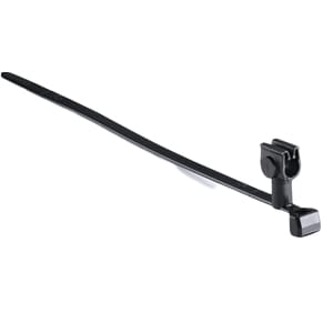 The MOC to Swivel Tie is a rotatable routing clip coupled to a cable tie that keeps two routings secured and separated. Part number 156-01773 provides this functionality. Tie provides additional security against axial slip by clamping around solid tube, pipe or harness. The swivel coupler allows the two routings to rotate independently of each other.