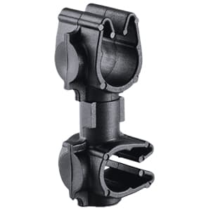 The MOC to MOC 180 is a rotatable dual routing clip that keeps two routings secured and separated. Part number 156-01926 provides this functionality. One clip is oriented 90 degrees from the other to provide alternative access for bundle attachment. A swivel coupler allows them to rotate independently of each other.