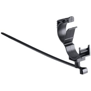 HellermannTyton's 1-Piece Cable Tie with Pipe Clip secures cables to tubular frame rails. Part number 156-02383 provides this functionality. The cable tie bundles wires, cables or tubes, and the C-clip snaps onto the tubular frame rail. The clip can be removed from the mounting surface and reinstalled without additional fasteners.
