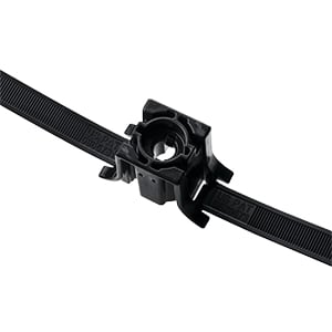 Wide strap minimizes pinching of soft hoses and convoluted tubing. Clamping rails increase circumferential grip on varying bundle diameters. Locking stud mount pawls allow for easy hand insertion. Nut or weld nesting counterbore provides flush mounting at the base.