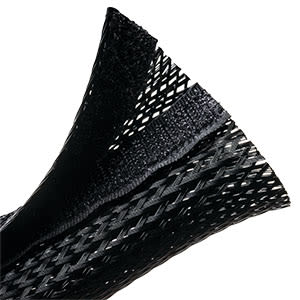 Flame retardant expandable braided sleeving with hook & loop strip for wrapping around cable assemblies. Part number 170-03157 provides this functionality. Color matched hook & loop closure provides an easy on and off installation, as well as convenient access for harness break-outs.