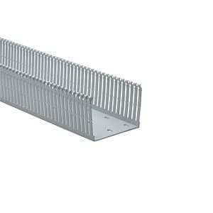 HellermannTyton High Density Slotted Wall Wiring Duct, 4" x 3", Adhesive, PVC, Gray, 120ft/Carton engineered for demanding identification needs in industrial environments. HellermannTyton High-Density Slotted Wall Wiring Duct features narrow fingers equaling a 2-to-1 finger ratio compared to standard slotted wiring duct. With the narrow fingers, compact designs and components are more easily accommodated. Narrow fingers reduce fanning of wires to terminal blocks, providing a neater appearance. Each finger features a double restriction to hold wires in the bottom portion of the duct, simplifying installation. Mounting holes are uniform in size to those in slotted and solid wall duct but are provided every two inches to accommodate compact designs and provide ease of installation. Nonpermanent adhesive allows repositioning prior to final installation.