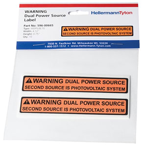 HellermannTyton Solar Label, WARNING DUAL POWER SOURCE?ǪSYSTEM, 4.125" x .75", VL, Red, 50/roll engineered for demanding identification needs in industrial environments. HellermannTyton pre-printed Solar Installation Labels are designed to meet the requirements of the National Electrical Code and the International Fire Code as well as being acceptable to the Authority Having Jurisdiction (AHJ). Labels are made with durable UV-stable materials and adhesives that are designed to stick to both baked enamel and powder coat surfaces. Where applicable, labels are made using reflective materials for first responder safety. Some pre-printed labels are printable using a thermal transfer printer when variable voltage or series data must be printed and displayed. Pre-Printed Vinyl Solar Labels are made with UV-stable inks and materials for durability and weather resistance. Supplied with an aggressive adhesive to ensure long life. Meets NEC?« & IFC standards for printed text, character height, color and outdoor UV stability to pass inspections. Pre-printed labels offer significant time and cost savings over high-priced plastic engraved phenolic placards and the lead time of purchased markers.