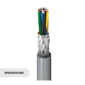 This cable features 8 pairs of 22 AWG, 7-strand tinned copper conductors with an overall Beldfoil/Tinned Copper Braid shield. Rated for 300V, the cable uses Semi-Rigid Polyvinylchloride (SR-PVC) insulation and a Polyvinylchloride (PVC) jacket. The cable operates up to 80C and is approved to NEC Type CMG standards. Approximate weight is 101 lbs/MFT with Chart 3 color coding.