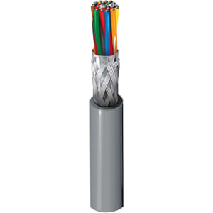 This cable features 15 pairs of 24 AWG, 7-strand tinned copper conductors with an overall Beldfoil/Tinned Copper Braid shield. Rated for 300V, the cable uses Semi-Rigid Polyvinylchloride (SR-PVC) insulation and a Polyvinylchloride (PVC) jacket. The cable operates up to 80C and is approved to NEC Type CMG and CSA Type AWM I A standards. Approximate weight is 123 lbs/MFT with Chart 5 color coding.