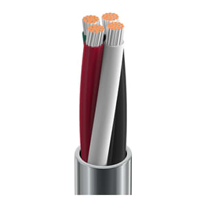This cable features 4 conductors of 18 AWG, 19-strand tinned copper conductors. Rated for 300V, the cable uses Polyvinylchloride (PVC) insulation and a Polyvinylchloride (PVC) jacket. The cable operates up to 60C and is approved to NEC Type CMG standards. Approximate weight is 48 lbs/MFT with Chart 1 color coding.