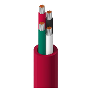 This cable features 4 conductors of 22 AWG, 7-strand tinned copper conductors. Rated for 300V, the cable uses Fluorinated Ethylene Propylene (FEP) insulation and a Fluorinated Ethylene Propylene (FEP) jacket. The cable is approved to NEC Type CMP standards. Approximate weight is 14 lbs/MFT with Black/White/Red/Green color coding.
