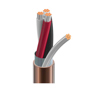 This cable features 3 conductors of 22 AWG, 7-strand tinned copper conductors with an overall Beldfoil shield. Rated for 300V, the cable uses Polypropylene (PP) insulation and a Polyvinylchloride (PVC) jacket. The cable operates from -20C to 90C and is approved to NEC Type CM standards. Approximate weight is 17 lbs/MFT with Black/Red/White color coding.