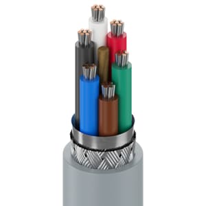 This cable features 6 conductors of 22 AWG, 7-strand tinned copper conductors with an overall Beldfoil/ Tinned Copper Braid shield. Rated for 300V, the cable uses Semi-Rigid Polyvinylchloride (SR-PVC) insulation and a Polyvinylchloride (PVC) jacket. The cable operates up to 80C and is approved to NEC Type CMG standards. Approximate weight is 43 lbs/MFT with Chart 1 color coding.