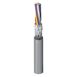 This cable features 9 conductors of 22 AWG, 7-strand tinned copper conductors with an overall Beldfoil/ Tinned Copper Braid shield. Rated for 300V, the cable uses Semi-Rigid Polyvinylchloride (SR-PVC) insulation and a Polyvinylchloride (PVC) jacket. The cable operates from -30C to 80C and is approved to NEC Type CMG standards. Approximate weight is 57 lbs/MFT with Chart 1 color coding.