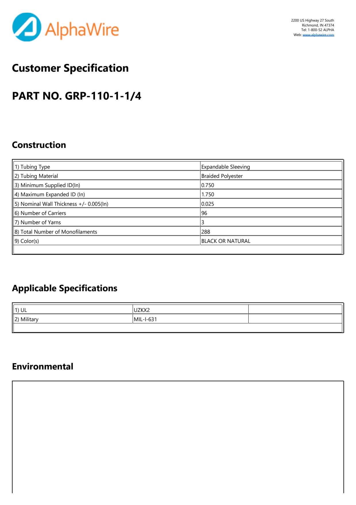 Alpha G11011/4 GY003 is a robust braided polyethylene (PE) tubing designed to perform in extreme temperature conditions, ranging from -70°C to 125°C. With an expanded inner diameter of 1.75 inches and a nominal inner diameter of 0.75 inches, this lightweight tubing, weighing approximately 5 lbs per 1000 feet, is ideal for various applications including fluid transfer, electrical insulation, and mechanical protection in industrial settings. The G11011/4 GY003 meets stringent industry standards such as UL UZKX2 and MIL-I-631, ensuring both reliability and safety for your projects.