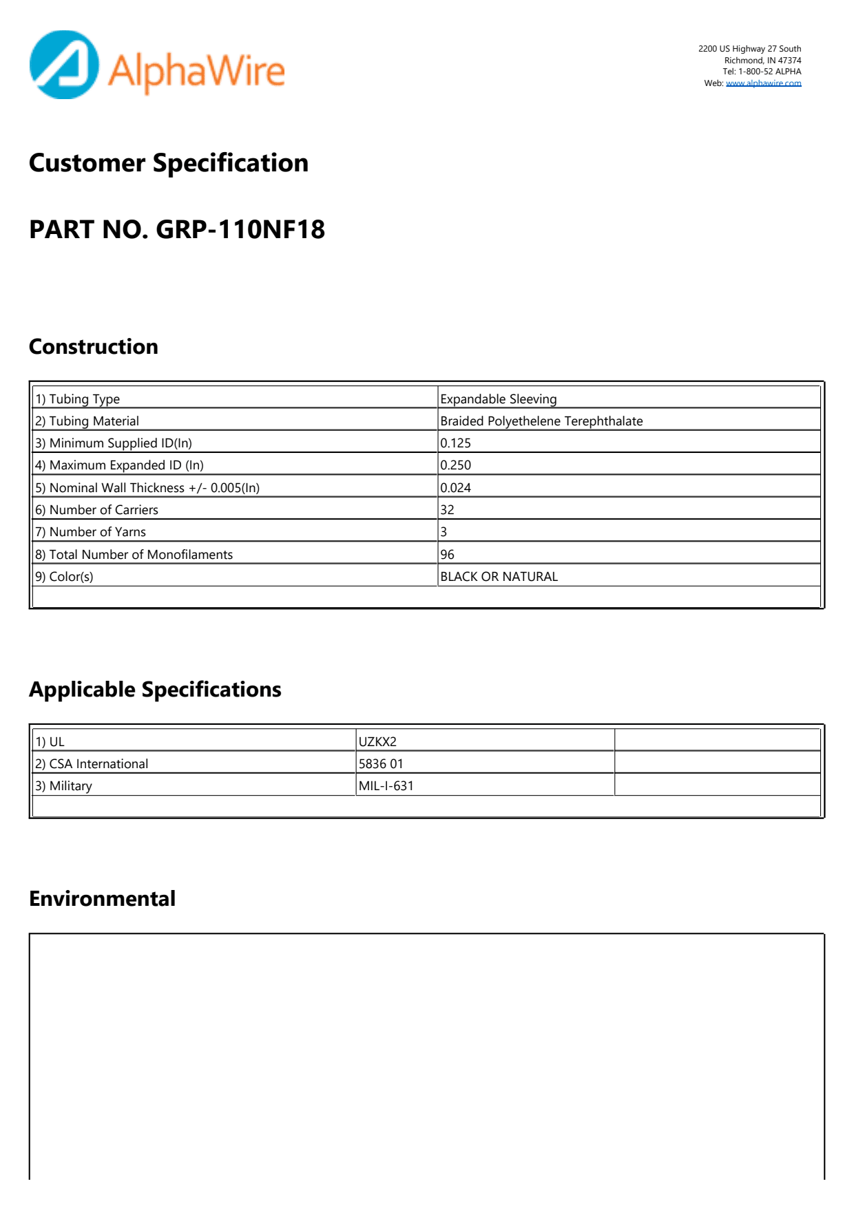 The Alpha G110NF18 BK005 is a high-quality braided PET tubing engineered for optimal performance in extreme temperature conditions, with a minimum temperature rating of -70°C and a maximum of 125°C. Featuring an expanded inner diameter of 0.25 inches and a nominal inner diameter of 0.125 inches, this lightweight tubing is ideal for applications such as fluid transfer, electrical insulation, and general industrial use. Additionally, it meets critical safety standards, including UL UZKX2, CSA 5836 01, and MIL-I-631, ensuring reliability in demanding environments. Enhance your projects with the Alpha G110NF18 BK005 for durable and efficient performance.