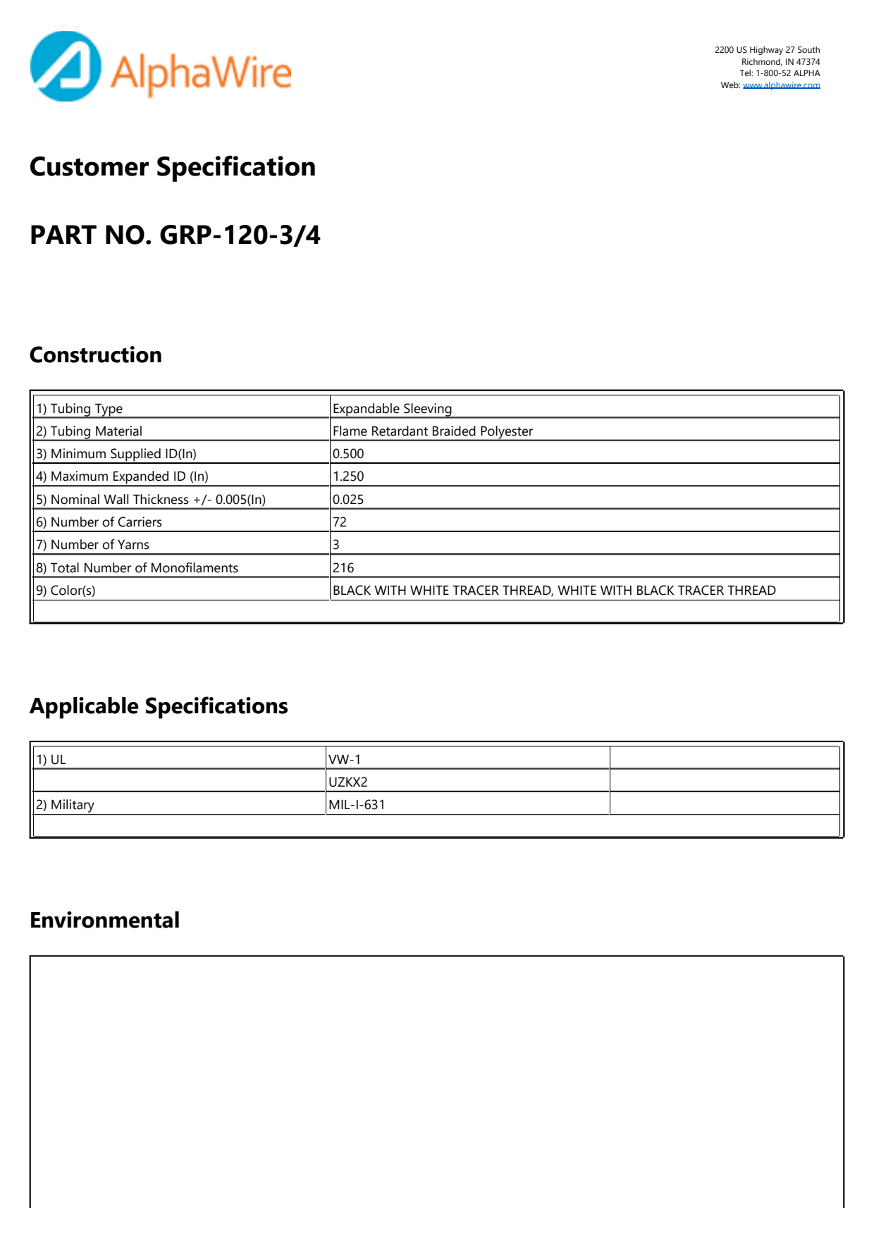Alpha G1203/4 WH002 is a high-performance braided polyethylene (PE) tubing designed for a wide range of applications, including industrial, automotive, and aerospace environments. This versatile tubing can withstand extreme temperatures, with a minimum temperature rating of -75°C and a maximum temperature rating of 125°C, making it suitable for both cold and hot applications. With an expanded inner diameter of 1.25 inches and a nominal inner diameter of 0.5 inches, it provides excellent flow characteristics while maintaining durability. Weighing approximately 8.7 lbs per thousand feet, Alpha G1203/4 WH002 is lightweight yet robust. It also meets stringent safety and performance standards, including UL UZKX2, MIL-I-631, and UL VW-1, ensuring reliability in critical applications.