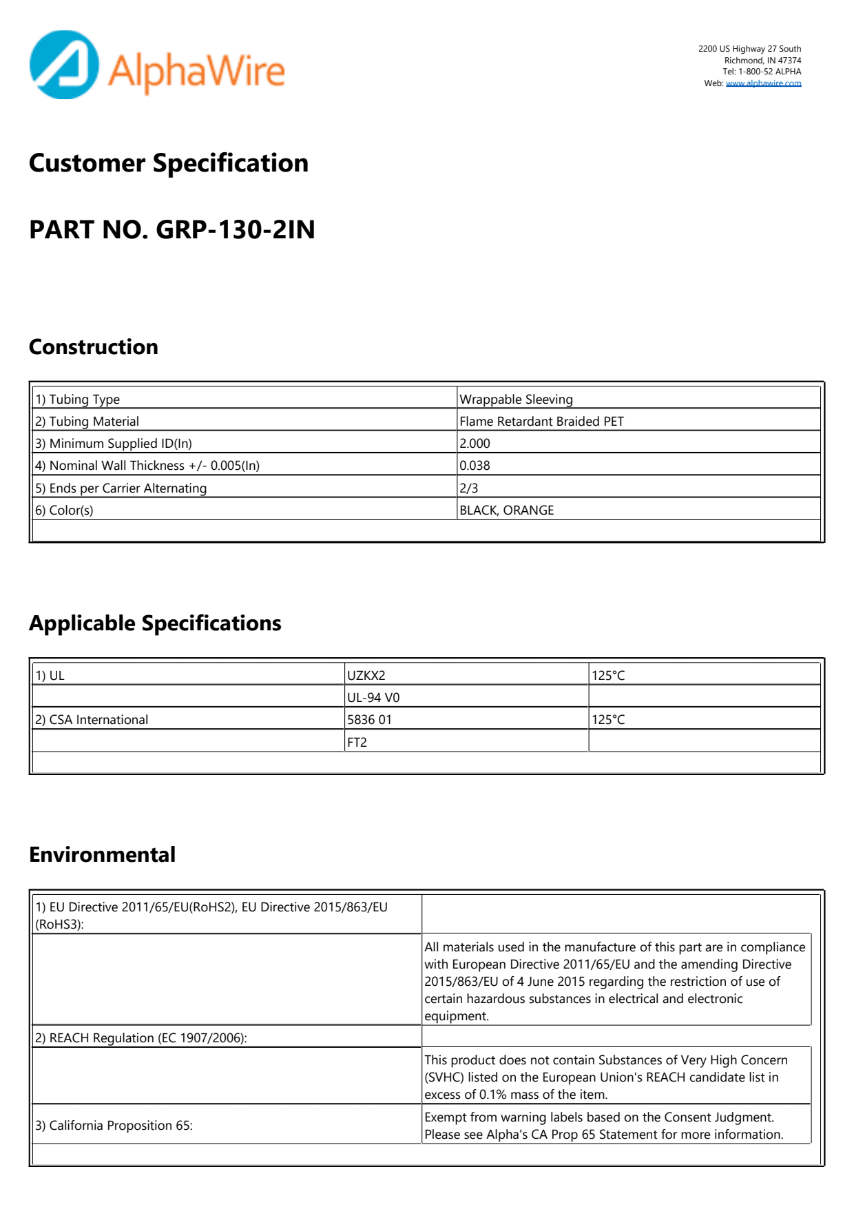 Alpha G1302IN OR008 is a high-performance wrappable braided PET sleeving product designed to withstand extreme temperatures ranging from -70°C to 125°C. With a nominal inner diameter of 2.0 inches and a lightweight design of approximately 0.9 lbs per thousand feet, this material is perfect for a variety of applications including cable management, insulation, and protection in harsh environments. Alpha G1302IN OR008 meets stringent safety and environmental standards, boasting additional ratings such as UL UZKX2, UL-94 V0, CSA 5836 01, CSA FT2, and compliance with CA Prop 65, RoHS, and REACH Regulation (EC 1907/2006). Choose Alpha G1302IN OR008 for reliable performance and durability in your next project.