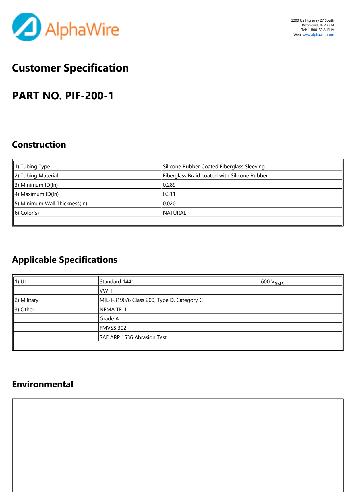 Alpha PF2001 NA005 is a high-performance silicone rubber-coated fiberglass braid that excels in extreme temperature applications, with a remarkable temperature range from -70°C to 200°C. This versatile product features an expanded inner diameter of 0.404 inches and a nominal inner diameter of 0.294 inches, making it ideal for a variety of industrial and commercial uses, including insulation and protection for wires and cables in harsh environments. Weighing approximately 1.2 lbs per linear foot, Alpha PF2001 NA005 is not only lightweight but also meets stringent safety and performance standards, including UL 1441, UL VW-1, NEMA VS-1, and MIL-I-3190E, ensuring reliability and durability in demanding applications.PF2001 NA005