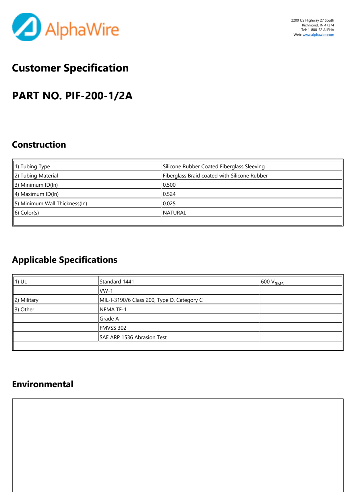 Alpha PF2001/2A NA008 is a high-performance silicone rubber-coated fiberglass braid hose designed to withstand extreme temperatures ranging from -70°C to 200°C. With an expanded inner diameter of 0.642 inches and a nominal inner diameter of 0.512 inches, this hose is both flexible and durable, making it ideal for a variety of applications including automotive, aerospace, and industrial environments. Weighing approximately 6.6 lbs per 1000 feet, Alpha PF2001/2A NA008 meets stringent safety and performance standards with additional ratings including UL 1441, UL VW-1, NEMA VS-1, and MIL-I-3190E, ensuring reliability and compliance in demanding conditions.PF2001/2A NA008