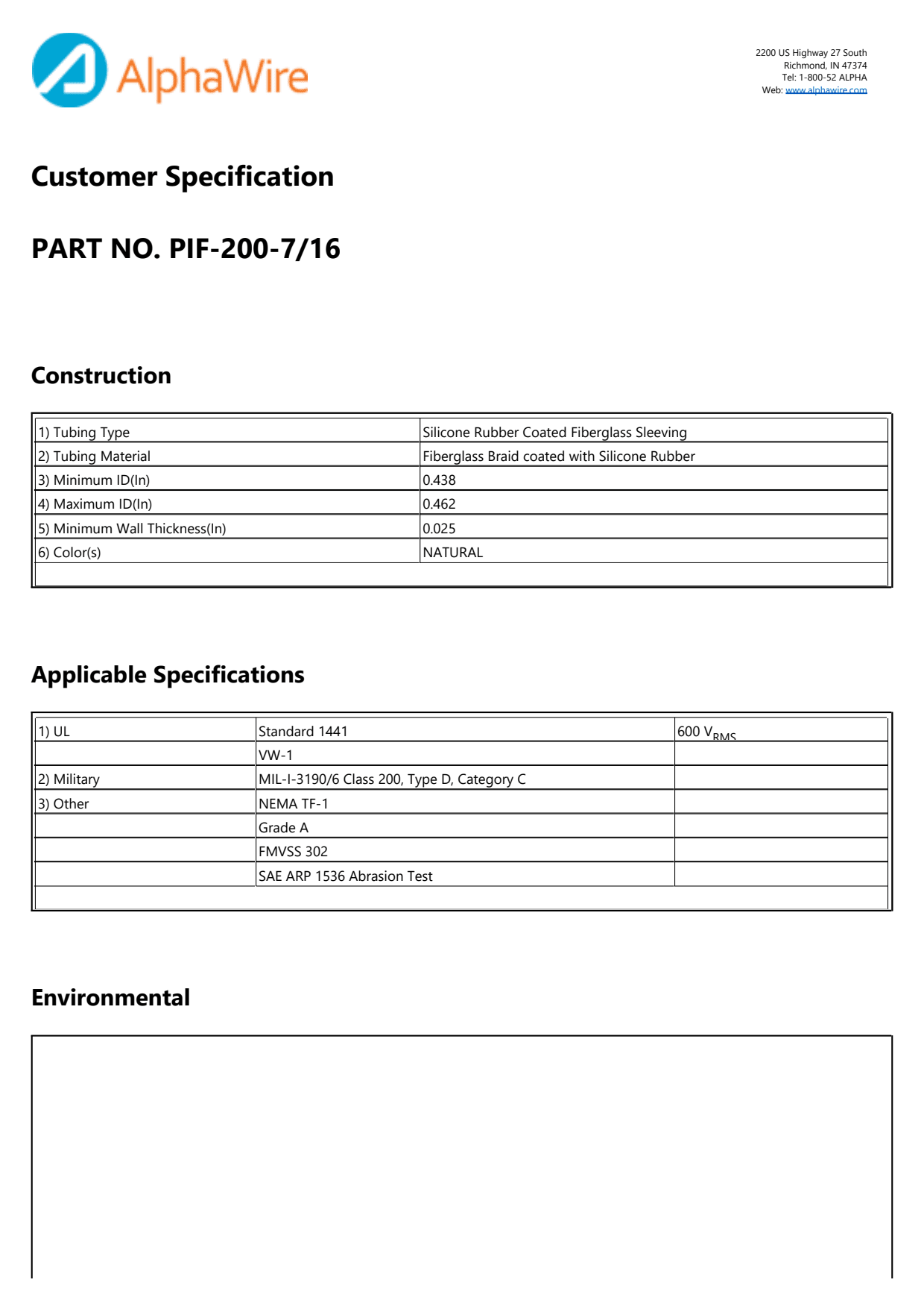 Alpha PF2007/16 NA005 is a high-performance silicone rubber-coated fiberglass braid designed for extreme temperature applications. This versatile product can withstand temperatures ranging from -70°C to 200°C, making it ideal for a variety of demanding environments. With an expanded inner diameter of 0.58 inches and a nominal inner diameter of 0.45 inches, it offers excellent flexibility and durability. Weighing approximately 2.3 lbs per linear foot, Alpha PF2007/16 NA005 is not only lightweight but also meets stringent safety and performance standards, including UL 1441, UL VW-1, NEMA VS-1, and MIL-I-3190E. This makes it suitable for applications in aerospace, automotive, and industrial sectors where reliability and resilience are paramount.PF2007/16 NA005
