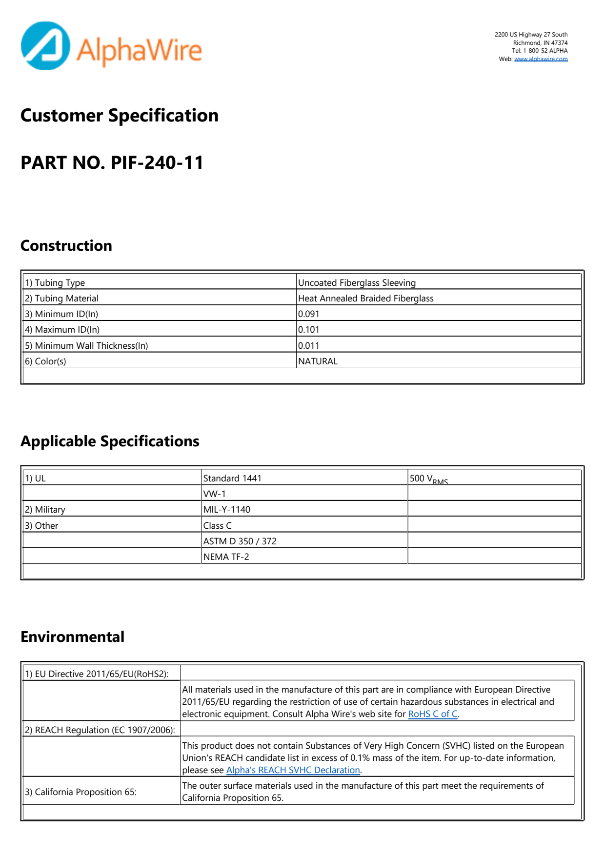 Alpha PF24011 NA005 is a high-performance uncoated fiberglass sleeving designed to withstand extreme temperatures ranging from -60°C to 648°C. With an expanded inner diameter of 0.185 inches and a nominal inner diameter of 0.095 inches, this lightweight sleeving weighs approximately 0.5 lbs per thousand feet, making it an ideal choice for various applications in electrical insulation and protection. Alpha PF24011 NA005 meets stringent safety standards with additional ratings including UL 1441, UL VW-1, and NEMA TF-2, ensuring reliability and durability in demanding environments.PF24011 NA005