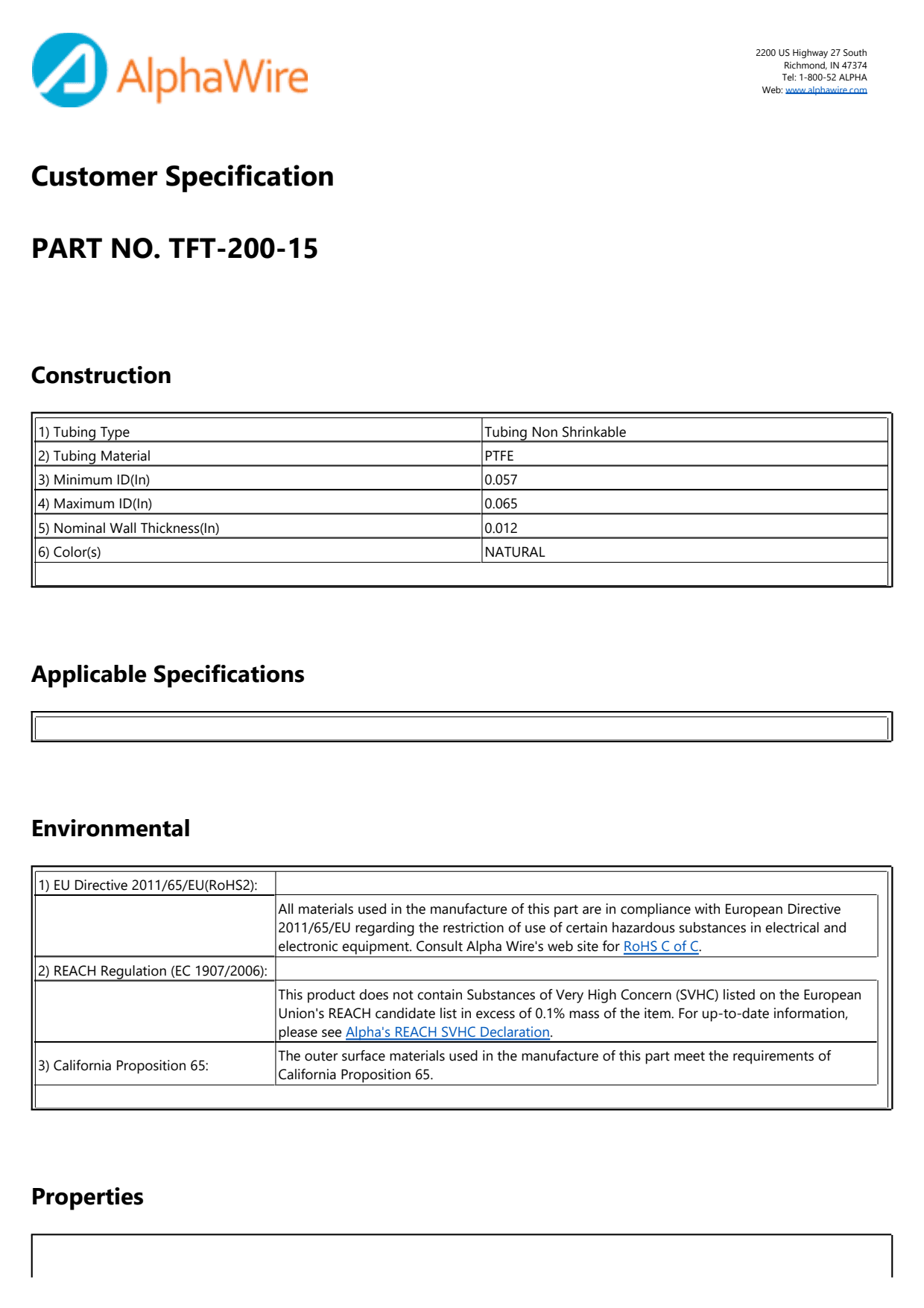 Alpha TFT20015 NA005 is a high-performance PTFE tubing designed to withstand extreme temperatures ranging from -65°C to 260°C. With a nominal inner diameter of 0.065" and a size range starting at 0.057", this tubing is ideal for a variety of applications including chemical processing, food and beverage, and pharmaceutical industries. Weighing approximately 3 lbs per thousand feet, Alpha TFT20015 NA005 meets ASTM D 3295 standards, ensuring reliability and durability in demanding environments.